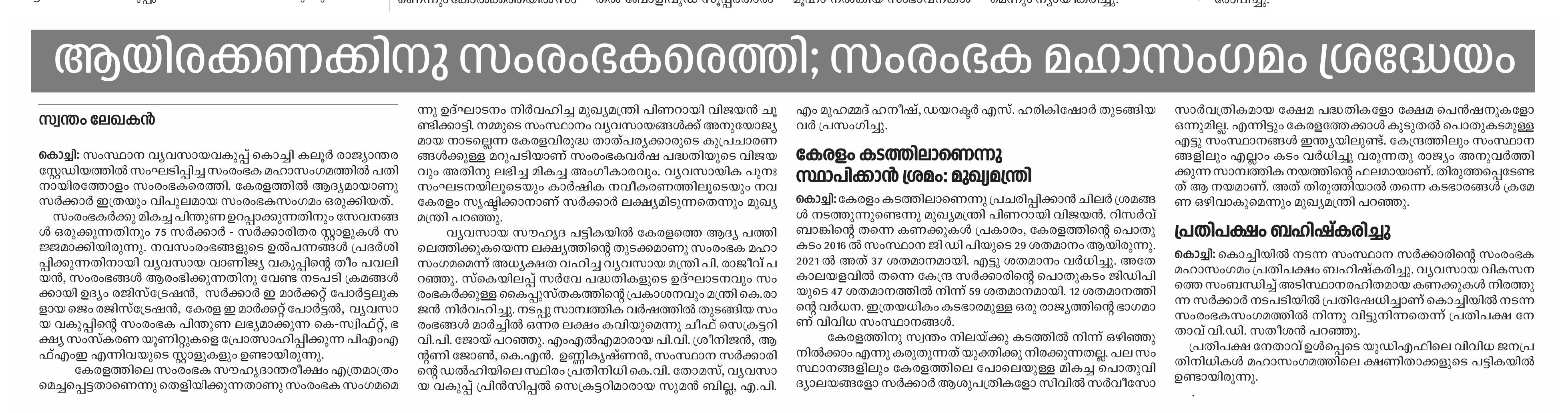| വ്യവസായ രംഗത്ത് ഉണ്ടായത് വന് മുന്നേറ്റം- കൂടുതല് വായിക്കാന്... | ആയിരകണക്കിനു സംരംഭകരെത്തി, സംരംഭക മഹാസംഗമം- കൂടുതല് വായിക്കാന്... | സംരംഭക മഹാസംഗമം, കുപ്രചാരണം നടത്തുന്നവര്ക്കുള്ള മറുപടി: മുഖ്യമന്ത്രി- കൂടുതല് വായിക്കാന്... |