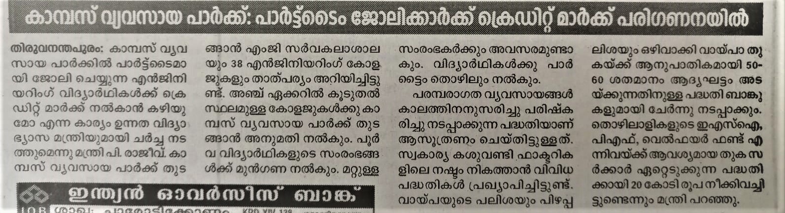 | കാമ്പസ് വ്യവസായ പാര്ക്ക്: പാര്ട്ട്ടൈം ജോലിക്കാര്ക്ക് ക്രെഡിറ്റ് മാര്ക്ക് പരിഗണനയില്- കൂടുതല് വായിക്കാന്... |