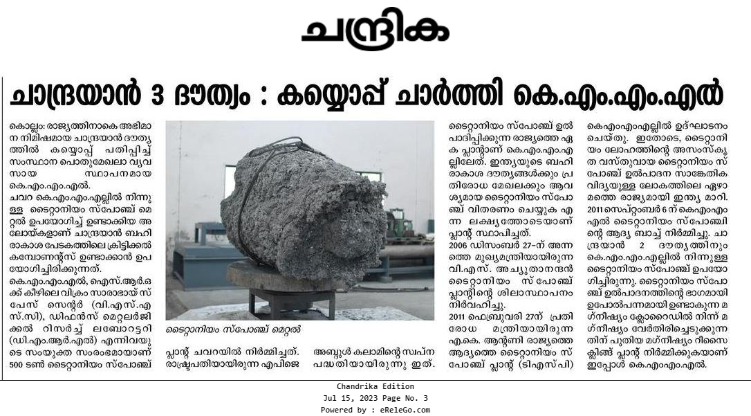 | ചാന്ദ്രയാന് 3 ദൗത്യം: കയ്യൊപ്പ് ചാര്ത്തി കെ.എം.എം.എല്- കൂടുതല് വായിക്കാന്... |