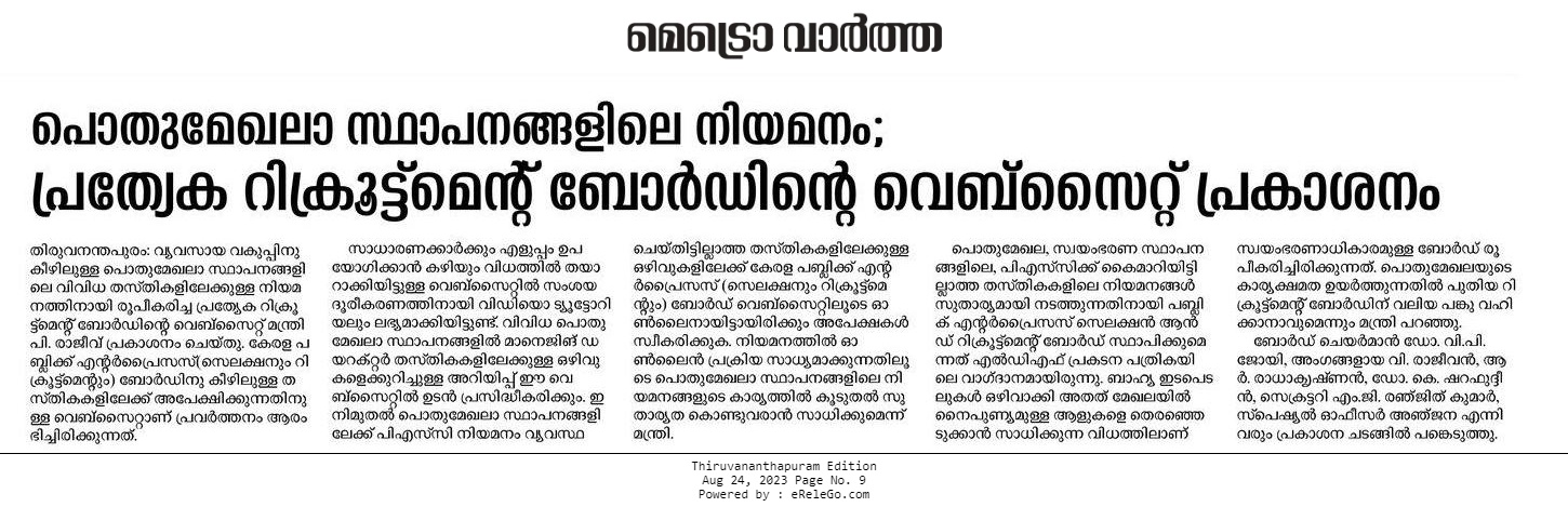 പൊതുമേഖലാ സ്ഥാപനങ്ങളിലെ നിയമനം; പ്രത്യേക റിക്രൂട്ട്മെന്റ് ബോര്ഡിന്റെ വെബ്സൈറ്റ് പ്രകാശനം- കൂടുതല് വായിക്കാന്... |