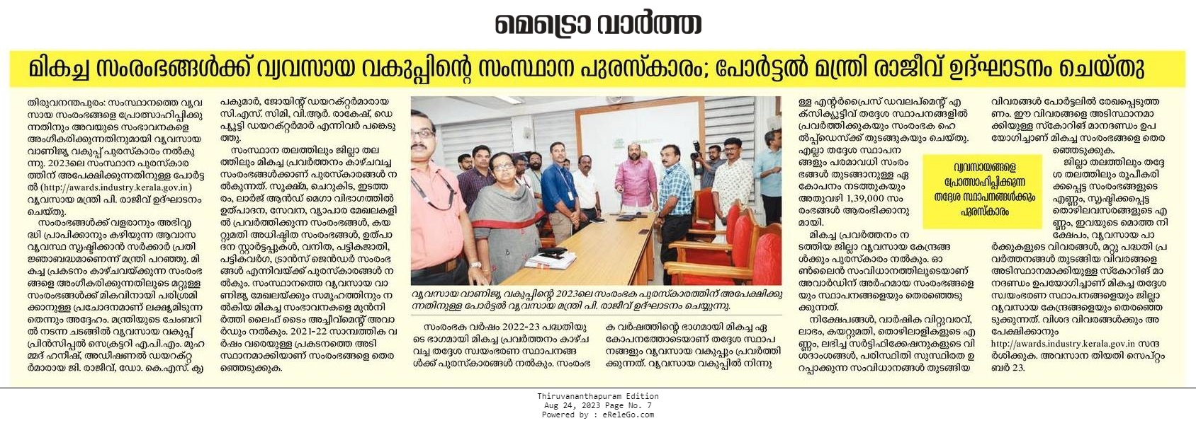 മികച്ച സംരംഭങ്ങള്ക്ക് സംസ്ഥാന പുരസ്കാരം; പോര്ട്ടല് ഉദ്ഘാടനം ചെയ്തു- കൂടുതല് വായിക്കാന്... | പോര്ട്ടല് ഉദ്ഘാടനം ചെയ്തു;മികച്ച സംരംഭങ്ങള്ക്ക് പുരസ്കാരവുമായി വ്യവസായ വകുപ്പ്- കൂടുതല് വായിക്കാന്... |