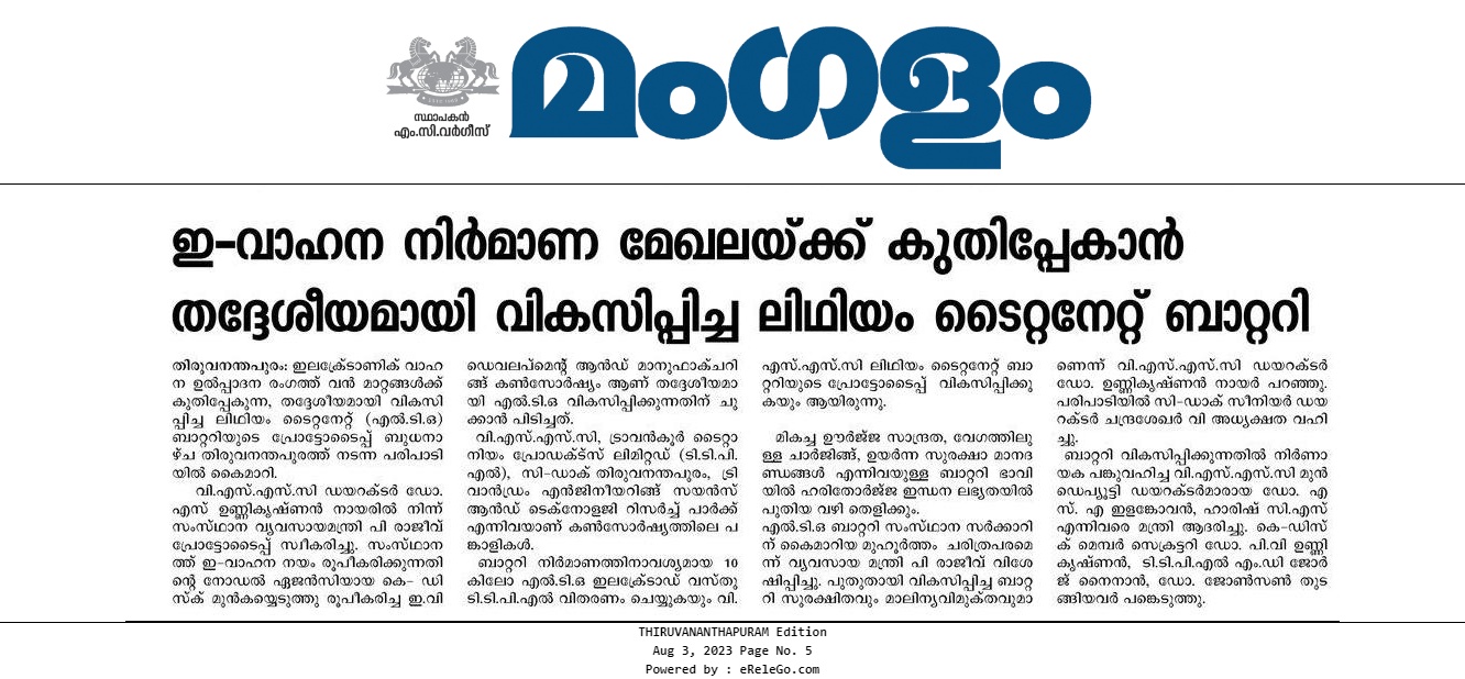 ലിഥിയം ടെറ്റനേറ്റ് ബാറ്ററി വികസിപ്പിച്ച് കേരളം- കൂടുതല് വായിക്കാന്... |
