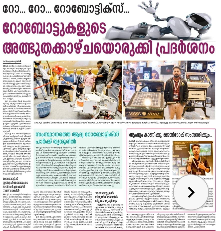 | തെങ്ങുചെത്തും റോബോട്ട്, നൃത്തമാടും മോഹിനി. കൂടുതൽ വായിക്കാൻ... | മിണ്ടാനാവാത്തവർക്കയി ഇനി മിണ്ടും കൈയുറ. കൂടുതൽ വായിക്കാൻ... | ജീവിതത്തിൽ ഇനി റോബോട്ടിക് വിപ്ലവം. കൂടുതൽ വായിക്കാൻ... | റോബോട്ടിക് സംരംഭകങ്ങൾ തൊഴിലവസരങ്ങൾ കൂട്ടും- പി രാജീവ്. കൂടുതൽ വായിക്കാൻ ... |