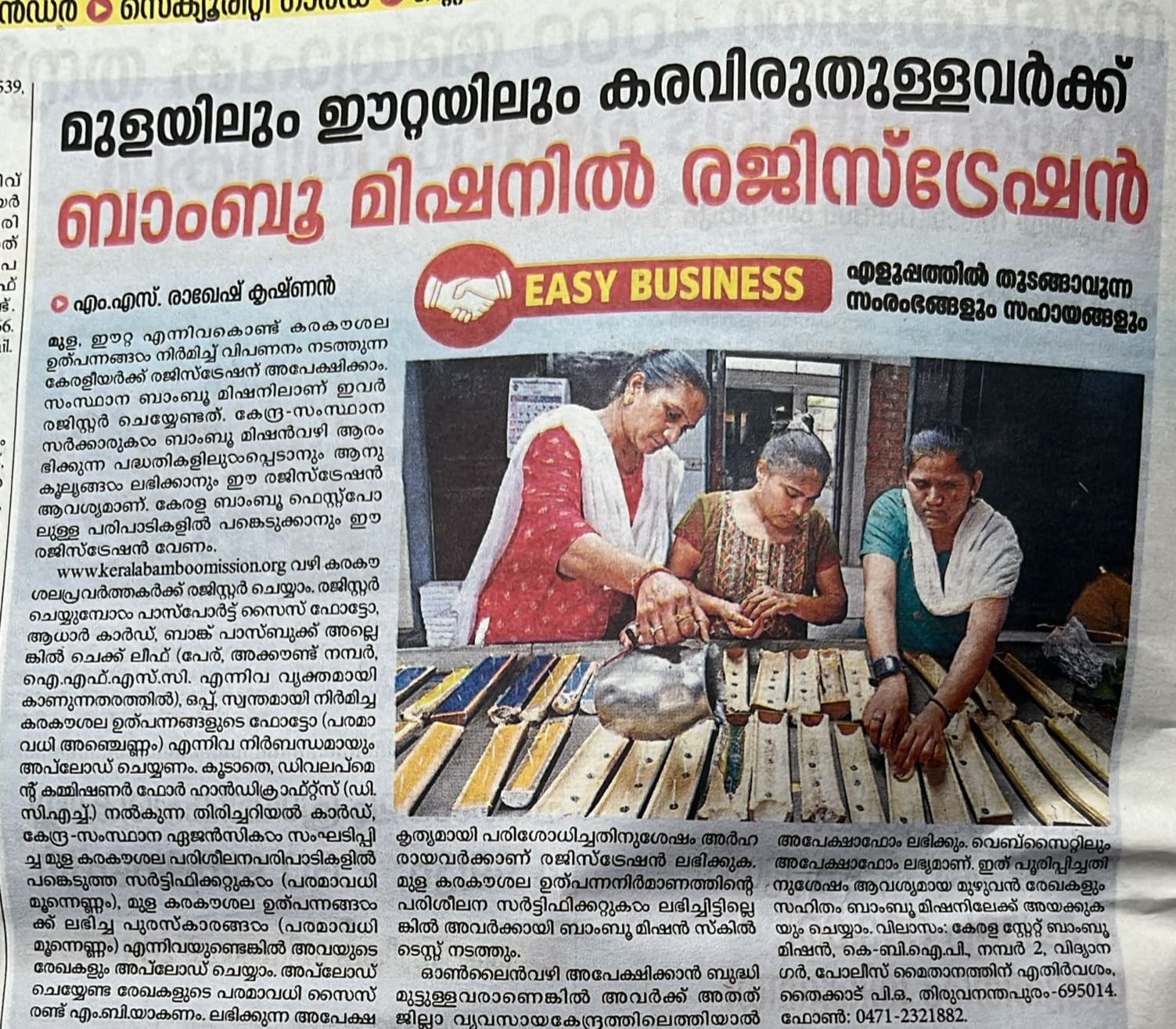 മുളയിലും ഈറ്റയിലും കരവിരുതുള്ളവര്ക്ക് ബാംബൂ മിഷനില് രജിസ്ട്രേഷന് |