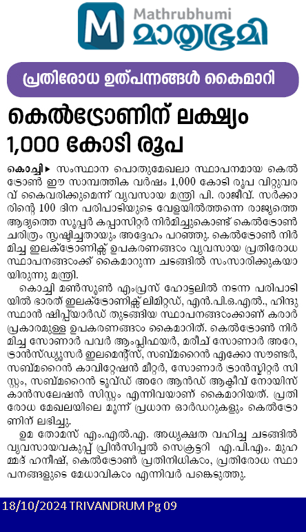 പ്രതിരോധ ഉപകരണങ്ങള് കൈമാറി കെല്ട്രോണിന് ലക്ഷ്യം 1,000 കോടി രൂപ. |