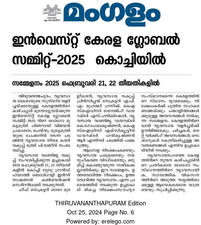 | കേരള കൗമുദി -ഒക്ടോബര് 25, 2024 | മംഗളം- ഒക്ടോബര് 25, 2024 | മാതൃഭൂമി- ഒക്ടോബര് 18,2024 | തൊഴില് വാര്ത്ത - ഒക്ടോബര് 10, 2024 |