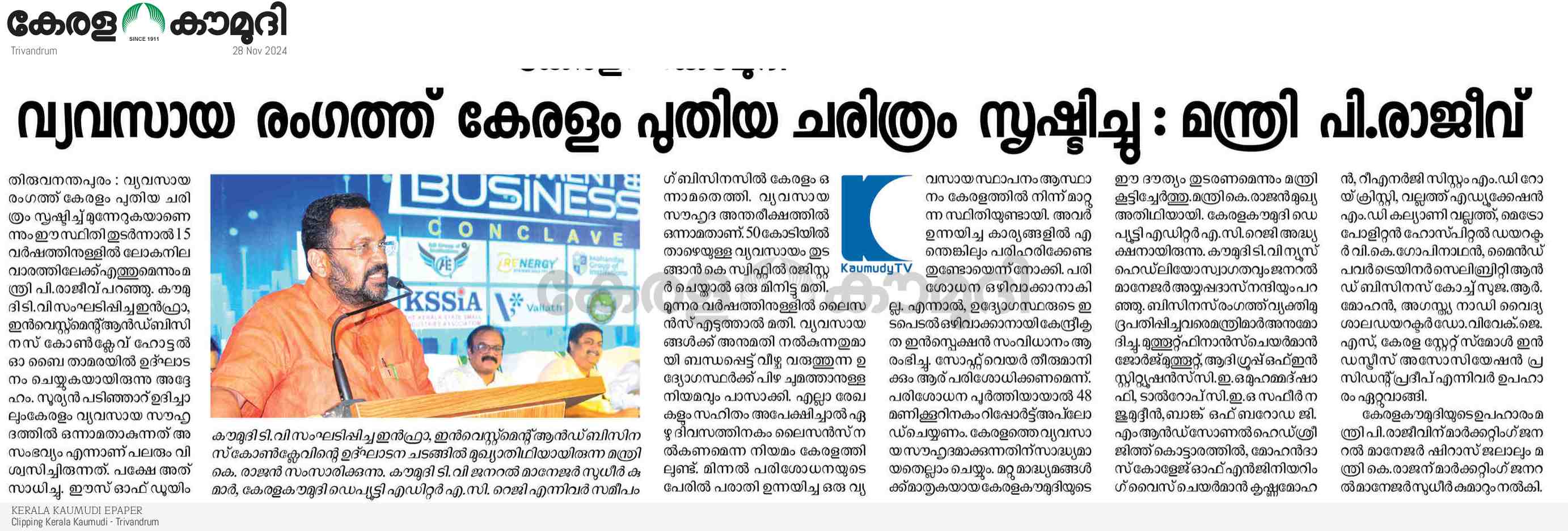 ഈസ് ഓഫ് ഡൂയിംഗ് ബിസിനസ് റാങ്കിങ്ങിലെ ചരിത്രനേട്ടം കേരളത്തില് ഉണ്ടായത് വ്യവസായ സൗഹൃദത്തില് പുത്തനുണര്വ്വ് |