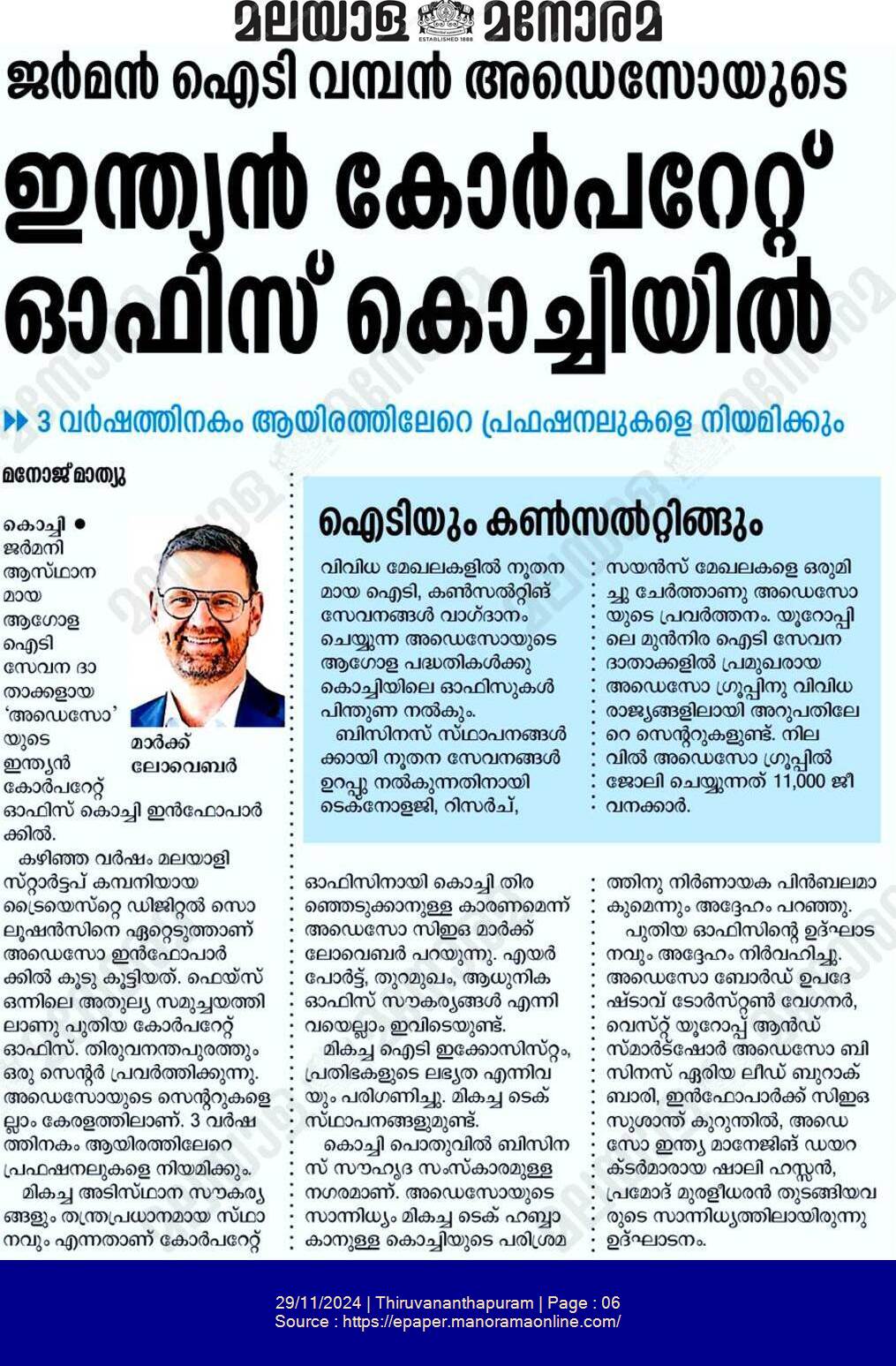 ജര്മന് ഐ ടി വമ്പന് അഡെസോയുടെ ഇന്ത്യന് കോര്പ്പറേറ്റ് ഓഫീസ് കൊച്ചിയില് |